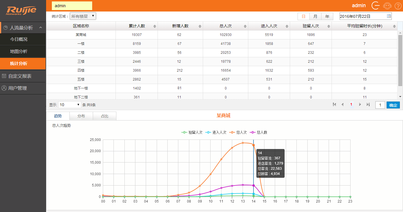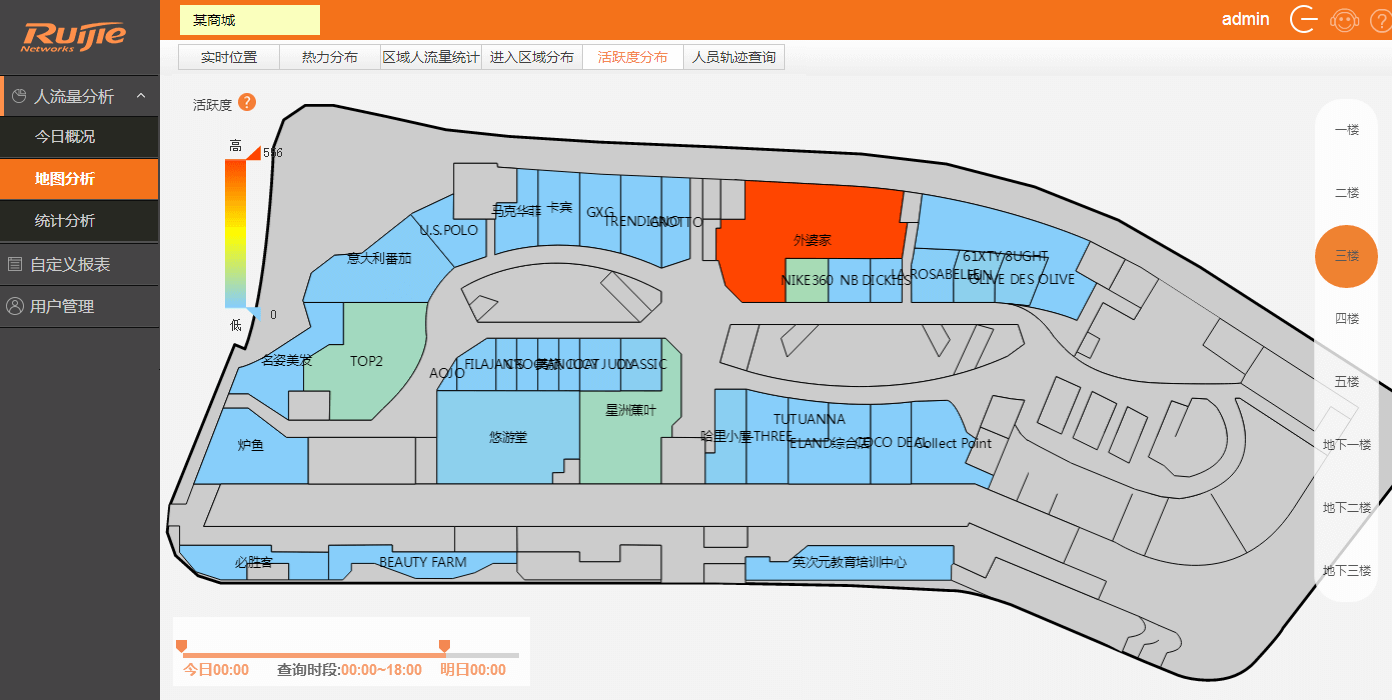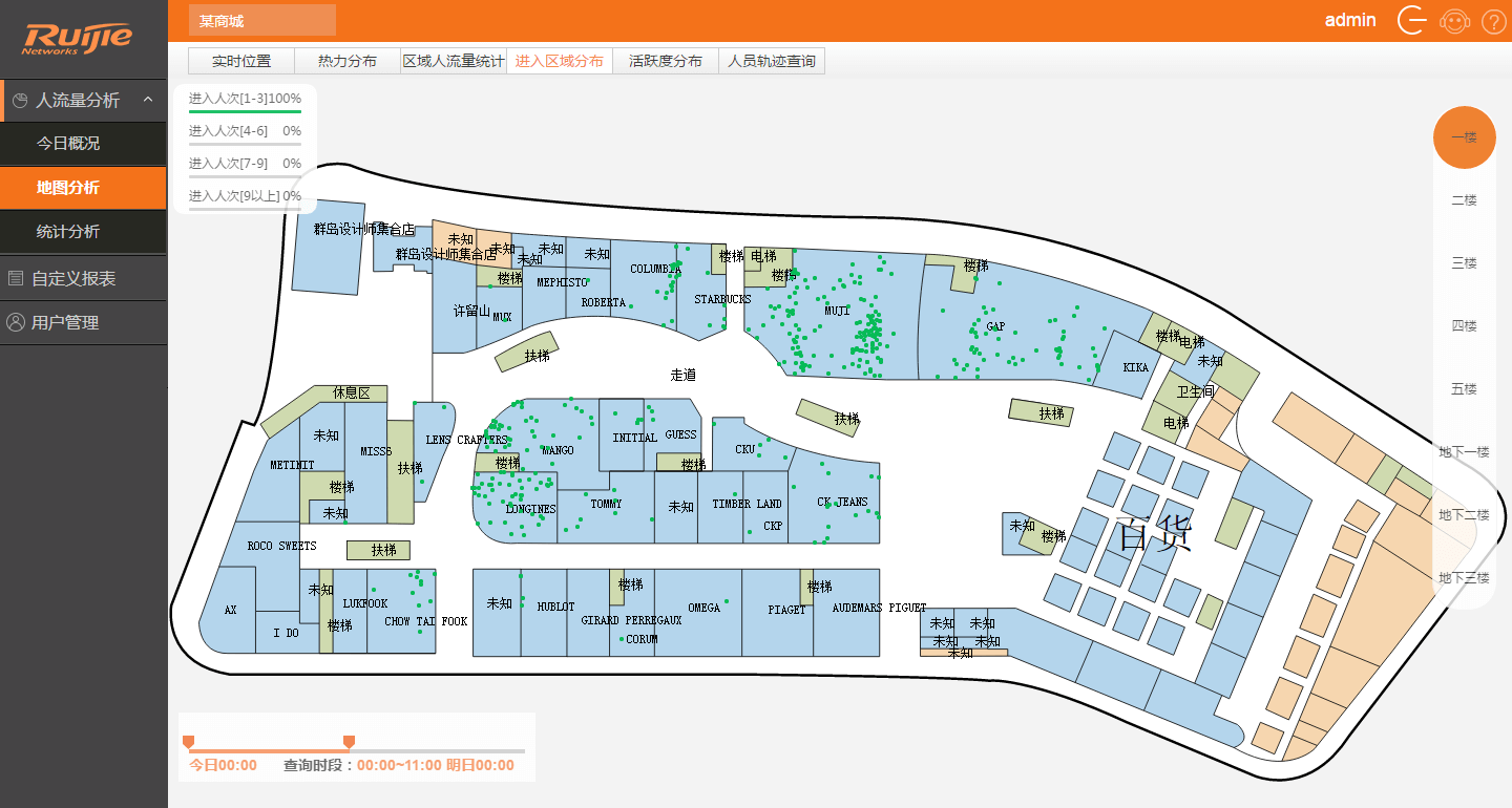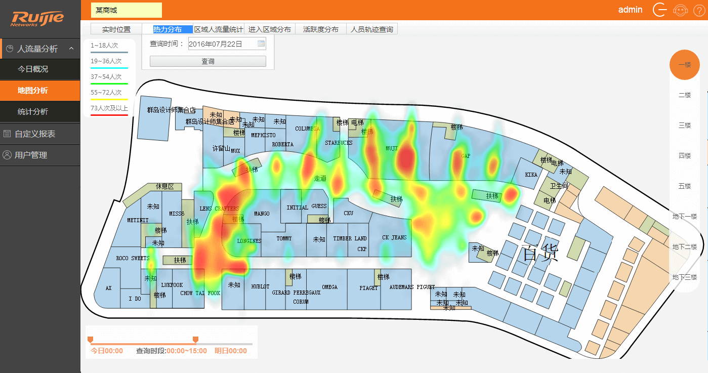 RG-RBIS的场所区域人流量分析:一方面在平面图上呈现进入每个区域人流的情况,为运营者提供一个直观的观察结果;例如分析店铺的人流量特点,帮助店铺或商场调整经营策略。