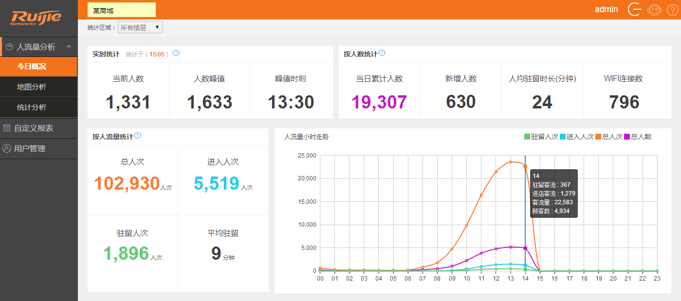 RG-RBIS 的人流量分析功能提供了当日实时人流量、人流量峰值、累计人数等基础的人流量数统计,还提供了重要的进入某个区域的概率(例如商场的进店率)、驻留率、Wi-Fi使用率等监控指标。同时通过图表的形式呈现出某个区域(例如某个店铺)的人流量情况、以及整个场所区域的人流量变化走势图。