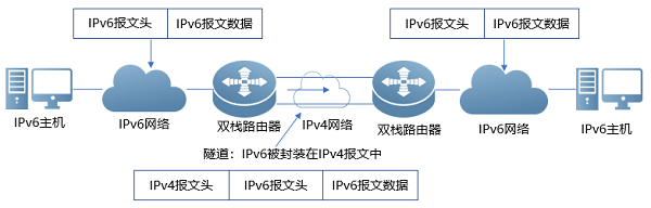 通过隧道技术,依靠现有IPv4设施,只要求隧道两端设备支持双栈,即可实现多个孤立IPv6网络的的互通,但是隧道实施配置比较复杂,也不支持IPv4主机和IPv6主机直接通信。