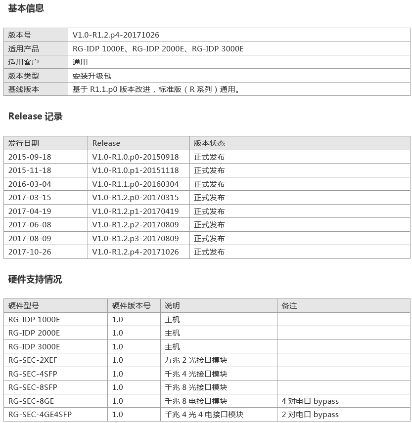 首页 >服务与支持 >软件下载 >第二代RG-IDP 1000E/2000E/3000E系列入侵检测防御系统R1.2.p4-20171026版本