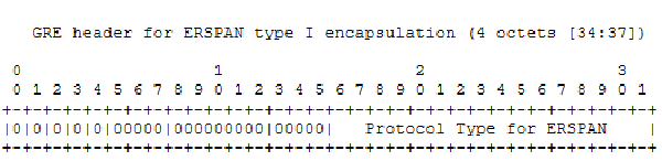 Type I的ERSPAN帧直接将IP+GRE封装在原始镜像帧头部之上,这种封装方式在原始帧之上增加了38字节:14(MAC) + 20 (IP) + 4(GRE)。这种格式的优势在于其头部尺寸紧凑,减少传输过程的开支,但因为其将 GRE Flag和Version字段全部设置为0,即不携带任何拓展字段,也导致Type I并没有大规模应用,这里就不过多展开。