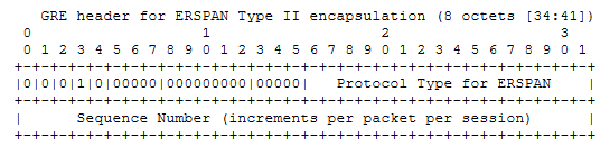 另外在GRE头部中的Protocol Type字段也有指明内部的ERSPAN类型,Protocol Type字段值为0x88BE表示是ERSPAN Type II,0x22EB 表示是ERSPAN Type III。