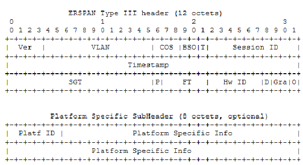 ERSPAN Type III复合报头包括一个强制的12字节头部和一个可选的8字节平台特定子头部。