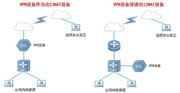 首先,要关注使用VPN隧道传输的数据是否需要加密。其次,要关注使用VPN的终端类型,不同的VPN技术当前支持的终端类型有所不同。最后,要关注VPN设备是作为出口NAT设备还是穿透出口NAT设备,如图6所示。