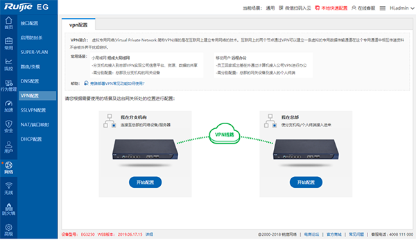 1)   登录设备的WEB界面,单击“网络”“VPN设置”进入VPN配置界面,单击“我在总部”下面的“开始配置”