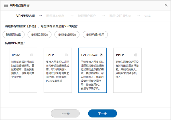 2)   随后进入VPN配置向导界面,单击“L2TP IPSec”。没有经验的使用者可以根据自身需求单击“隧道需加密”“支持IOS终端”“支持安卓终端”“支持WIN使用”其中的一项或多项,设备会推荐最合适的VPN类型