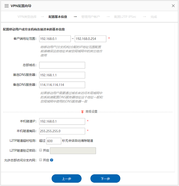 3)   在进行VPN基本信息的配置时需要注意,客户端使用地址要确保未在局域网中使用,否则会造成通信异常,此外建议DNS服务器配置成和局域网用户相同的DNS避免资源访问异常
