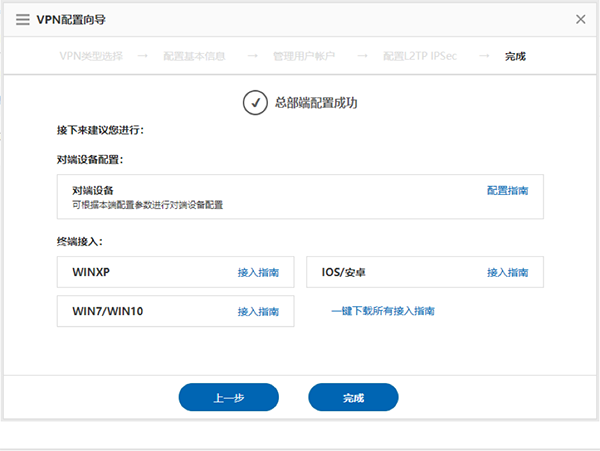 6)   在L2TP over IPSec VPN配置成功界面有终端配置指南的链接,网络管理员可将链接同步给VPN使用者,便于指导VPN使用者如何在终端上进行VPN配置