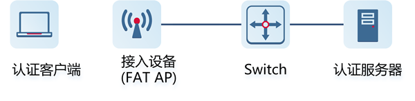 接入设备通常是指支持802.1X协议的网络设备。在Fit AP无线场景中,接入设备是指AC设备(如图2-1),在Fat AP无线场景中,接入设备是指AP设备(如图2-2)。它为认证客户端提供接入无线网的端口(该端口可以是物理接口或者逻辑接口),充当认证客户端和认证服务器之间的中介。其主要作用是完成客户端认证信息的上传、下达工作,并根据客户端的身份验证状态控制其对网络的访问权限。