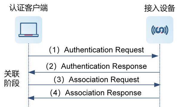 STA(Station,工作站点)上的认证客户端在探测到AP释放的无线信号后,主动发起关联请求,与接入设备交互协商出双方支持的通用速率、数据传输的密钥传递方式、加密方式等信息,完成关联过程。本阶段包含的报文交互过程如图2-3所示。