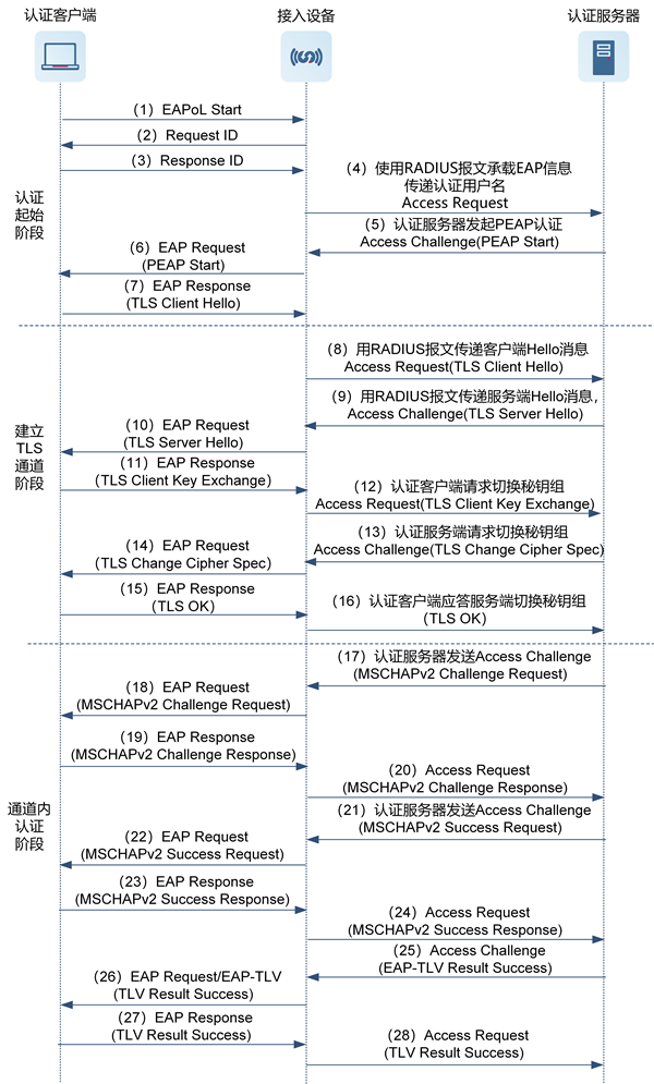 ●   通道内认证阶段:在PEAP协议的TLS安全通道建立成功之后,认证系统的3个角色在TLS安全通道内完成接入认证过程,其报文交互过程如图2-4中的编号(17)~(28)所示。